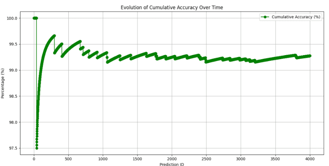 Le previsioni del sistema sono corrette e lo si dimostra nel tempo stabilizzandosi in accuratezza ad una soglia del 99,6%